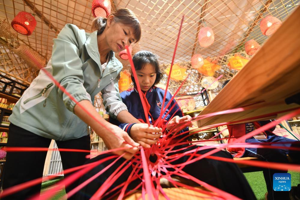 A student (R) learns the bamboo weaving skill from a teacher at Nandu primary school in Cenxi city, south China's Guangxi Zhuang Autonomous Region, Nov. 28, 2023. (Xinhua/Huang Xiaobang)