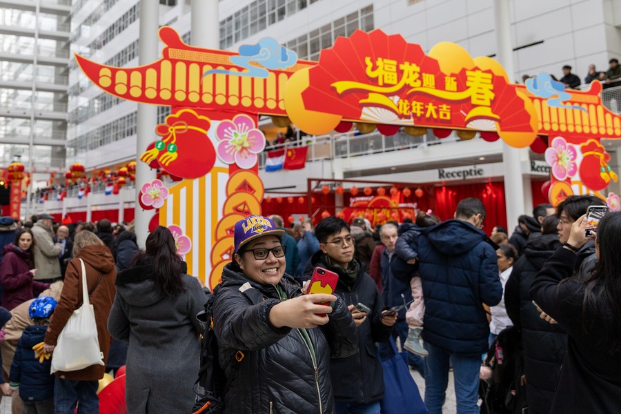 A person takes selfie during a temple fair to celebrate the Lantern Festival at the Atrium City Hall in The Hague, the Netherlands, Feb. 24, 2024. (Xinhua/Meng Dingbo)