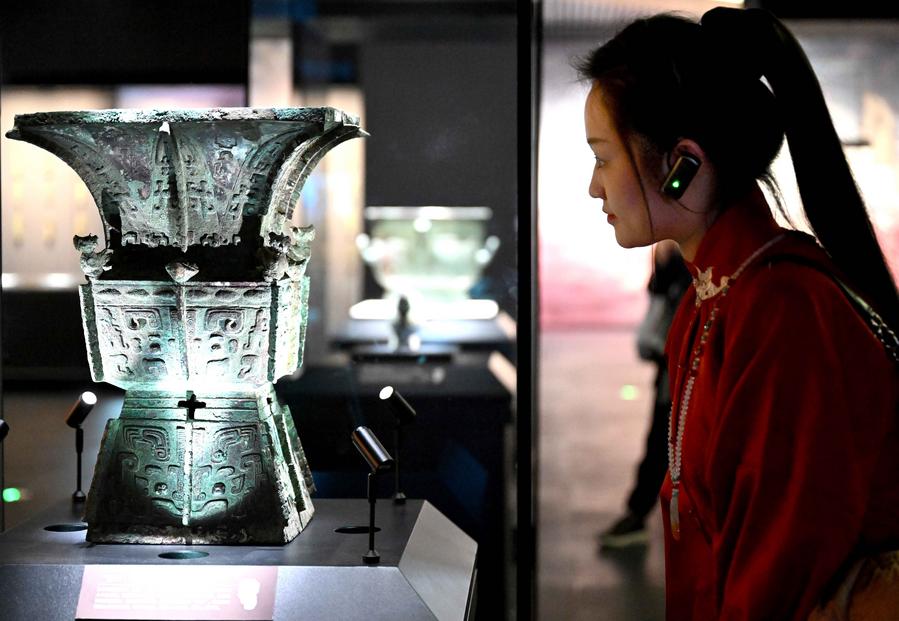 A visitor looks at an exhibit at the new building of Yinxu Museum in Anyang, central China's Henan Province, Feb. 26, 2024. (Xinhua/Li An)