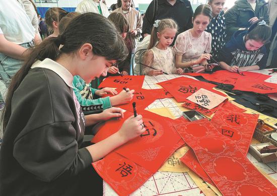 Russian children practice Chinese calligraphy during a cultural exchange event in Moscow on April 20, International Chinese Language Day. (TIAN BING/CHINA NEWS SERVICE)