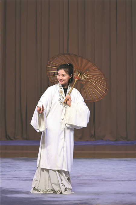 Peking Opera actress Chu Fengyi, who plays the role of Bai Suzhen, at the rehearsal.[Photo provided to China Daily]