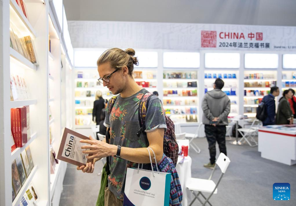 Visitors are pictured at the Chinese publishers' exhibition area at the 76th Frankfurt Book Fair in Frankfurt, Germany, Oct. 17, 2024. The Frankfurt Book Fair officially opened on Tuesday. Chinese publishers are making a significant impact at this year's fair, showcasing more than 3,500 books, including 1,500 in foreign languages. In addition to new book releases, Chinese publishers are holding numerous premieres and signing ceremonies for copyright agreements, with up to 1,000 books available for copyright trade. The fair will also feature a promotional event for the 2025 Beijing International Book Fair and a session on copyright trade between China and Europe. (Xinhua/Zhang Fan)