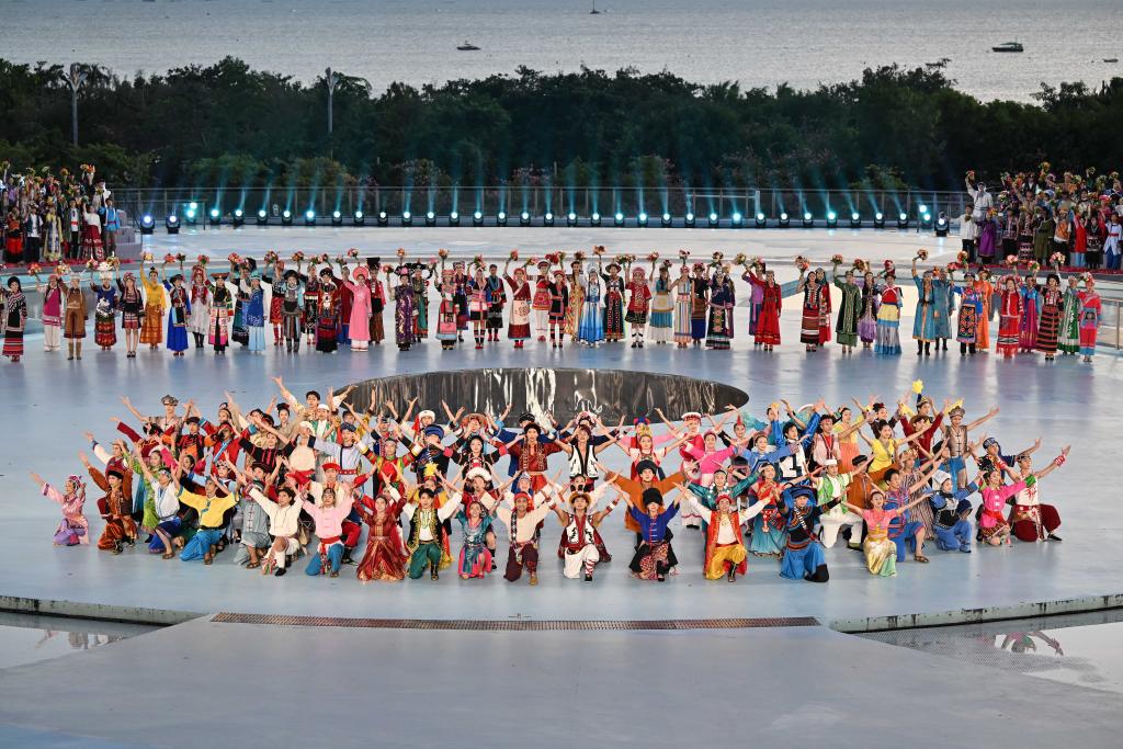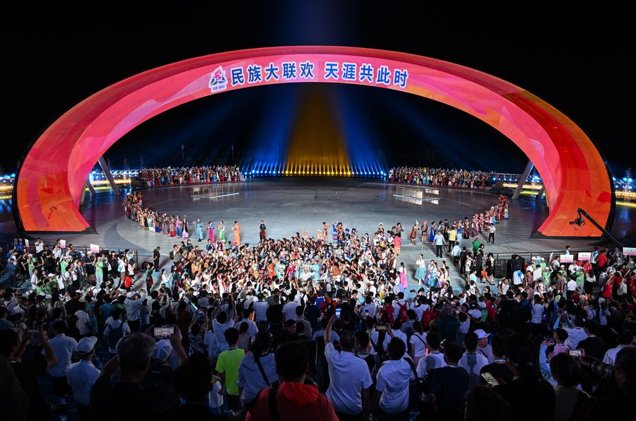 Artists celebrate with the audience at the end of a gala held at the 12th National Traditional Games of Ethnic Minorities of China in Sanya, south China's Hainan Province, Nov. 26, 2024. (Xinhua/Guo Cheng)