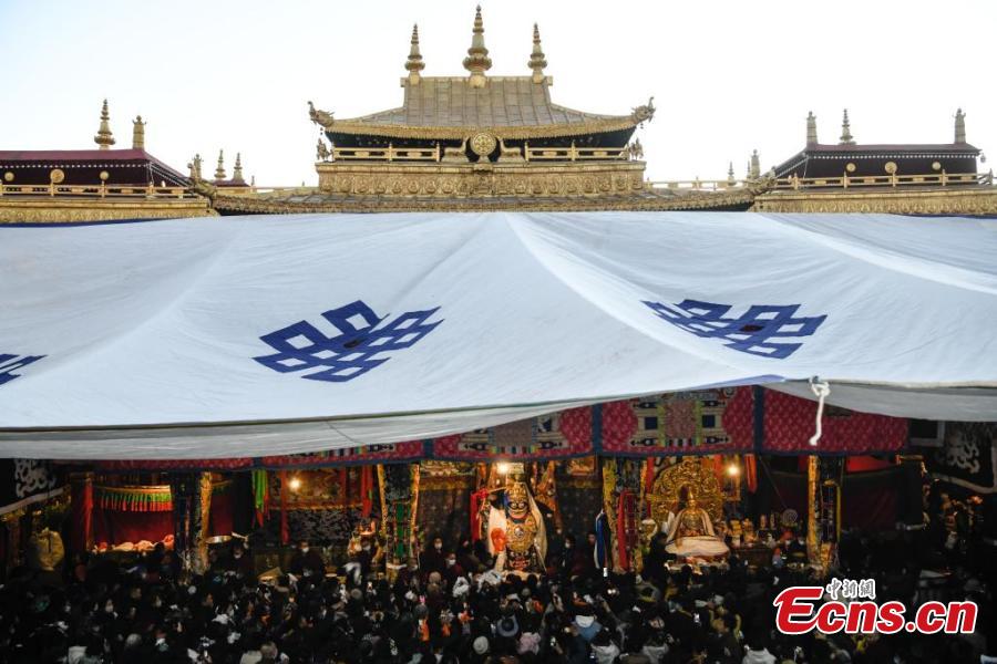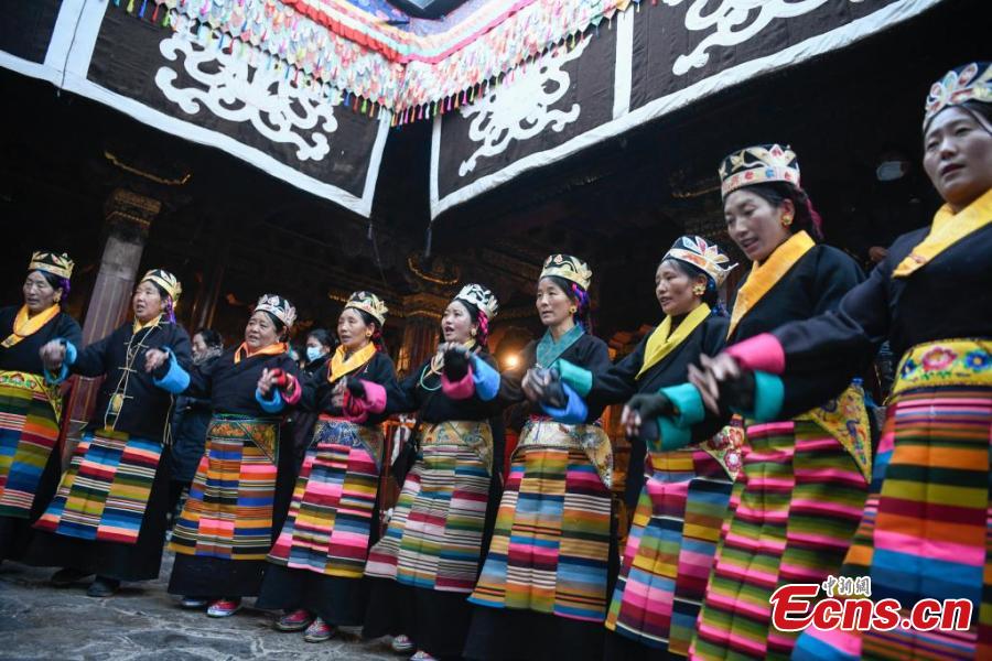 Women of the Tibetan ethnic group dance to celebrate the Fairy's Day celebration in front of the Jokhang Temple in Lhasa, southwest China's Xizang Autonomous Region, Dec. 15, 2024. (Photo/China News Service)