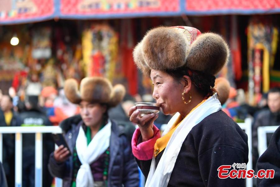 Women of the Tibetan ethnic group drink highland barley wine to celebrate the Fairy's Day at the Jokhang Temple in Lhasa, southwest China's Xizang Autonomous Region, Dec. 15, 2024. (Photo/China News Service)