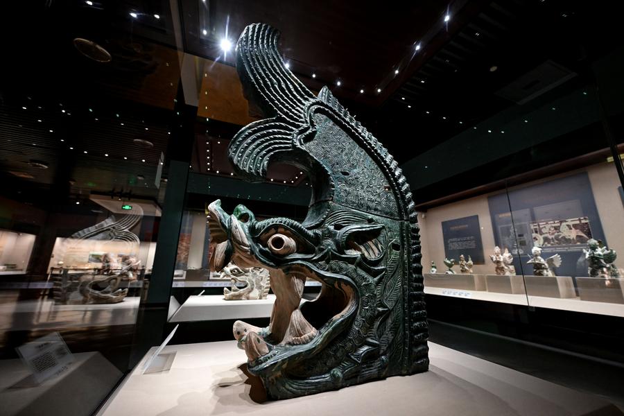 A replica of glazed Chiwen, a roof ornament on ancient Chinese buildings, which was unearthed from a Xixia imperial tomb, is displayed at Ningxia Museum in Yinchuan, northwest China's Ningxia Hui Autonomous Region, Nov. 26, 2024. (Xinhua/Feng Kaihua)