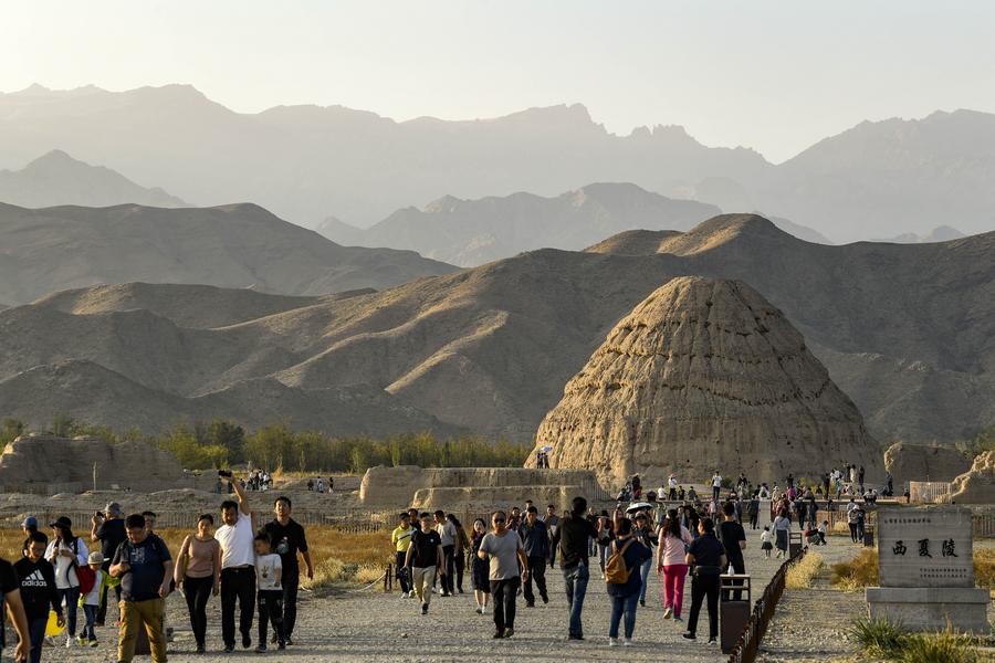 Tourists visit Xixia Imperial Tombs scenic area in Yinchuan, northwest China's Ningxia Hui Autonomous Region, Oct. 2, 2019. (Xinhua/Feng Kaihua)