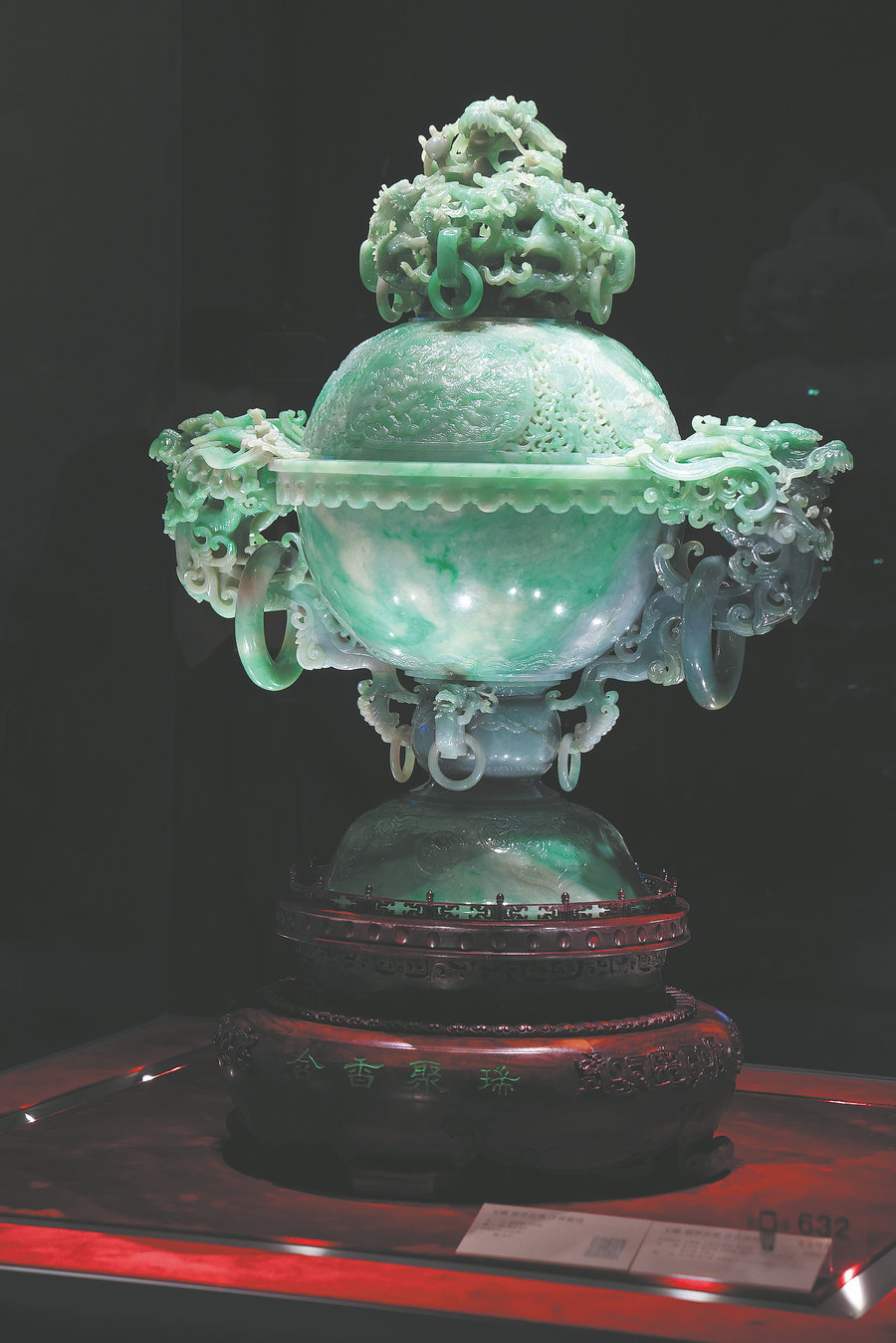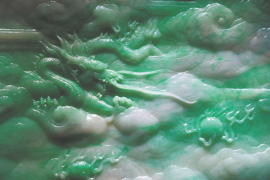 One of the nine dragons writhing in the sea of clouds that adorn a jadeite relief screen at the museum. (Wang Jing/China Daily)
