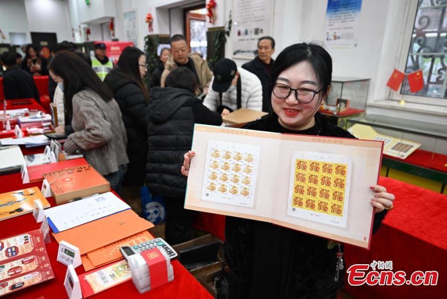A staff member displays the special stamps marking the Chinese zodiac Year of the Snake at a post office in Hangzhou, east China's Zhejiang Province, Jan. 5, 2024. (China News Service/Wang Gang)