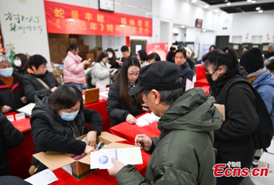 Stamp collectors wait to buy the special stamps marking the Chinese zodiac Year of the Snake at a post office in Hangzhou, east China's Zhejiang Province, Jan. 5, 2024. (China News Service/Wang Gang)