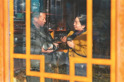 Dawa Drolma (R) learns about the business situation and the development progress of new products from the owner of a black pottery workshop in Maisu township, Dege county, Garze Tibetan Autonomous Prefecture, southwest China's Sichuan Province. (Xinhua/Shen Bohan)