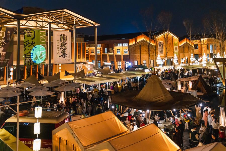 This photo taken on May 1, 2023 shows a view of the Taoxichuan Ceramic Art Avenue at night in Jingdezhen, east China's Jiangxi Province. (Xinhua)