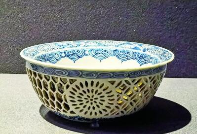 清康熙年間的青花鏤空花卉碗(“歷史之遇——中國與西亞古代文明交流展”展品)本報記者李韻攝/光明圖片