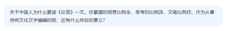 DeepSeek這一回答,就像是在滿是科技與狠活的信息自助餐里,端出了一盤熱氣騰騰、香氣四溢的“經典大餐”,讓人眼前一亮。它巧妙地把《論語》和當下的各種熱門話題“鎖死”,就像給老古董穿上了潮流新裝,毫無違和感。例如談到對抗“精神空心化”,它把《論語》比作能治“躺平”“內卷”這對“疑難雜癥”的“神藥”,孔子的智慧成了年輕人擺脫迷茫的“救命稻草”,還順手對比西方存在主義,讓不同文化在安頓心靈這件事上“battle”了一番,這操作直接拉高了我們思考的“天花板”。